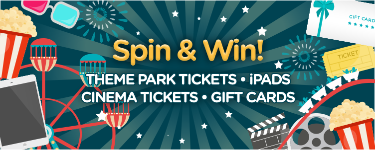 Play the Spin & Win for your chance to win one of our fantastic prizes, including Theme Park Tickets, iPads, Cinema Tickets and Gift Cards!